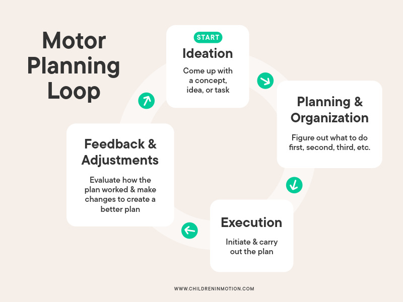 Motor planning, in its most basic form encompasses all of the small (but important) steps it takes to complete tasks. These stages include..